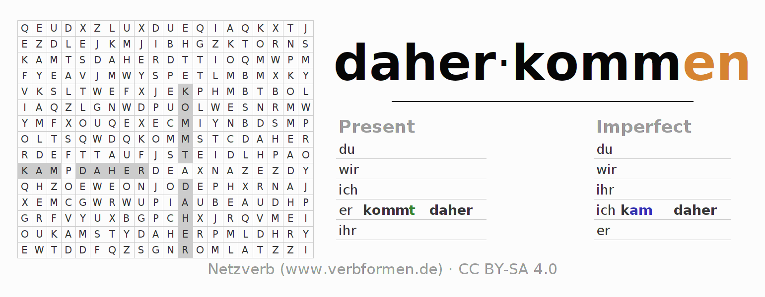 Worksheets are used generally for the conjugation of the verb daherkommen in teaching. The materials can be used as Open Educational Resources (OER) for exercises, for games and as Tasks (CC BY-SA 4.0). There are many different types of tasks available for the verb daherkommen. These are overview sheets with complete conjugation, puzzles and games that require joint learning. The entire educational material is available for free as a PDF download, as pictures and as an interactive browser version. In addition to the tasks, countless examples for daherkommen also provide an aid to using the verb.