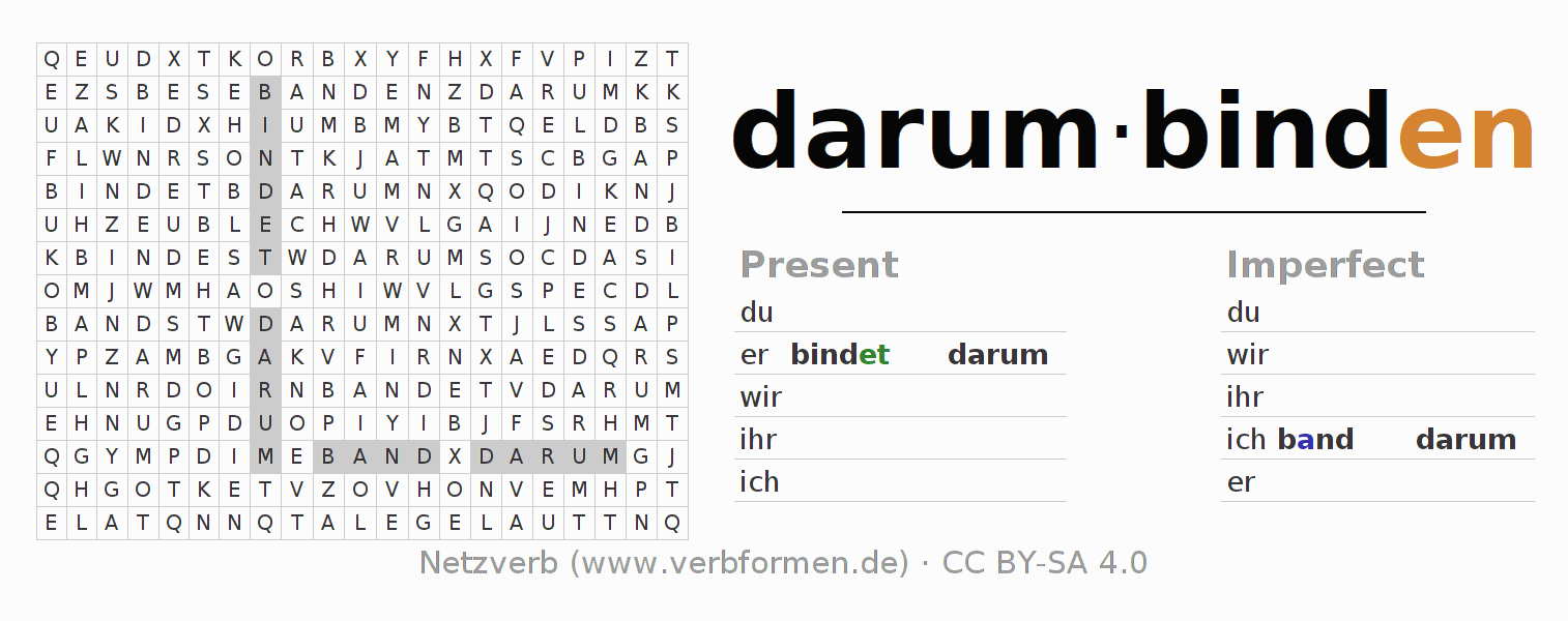 With these search word puzzles you can learn the conjugation of the German verb darumbinden.