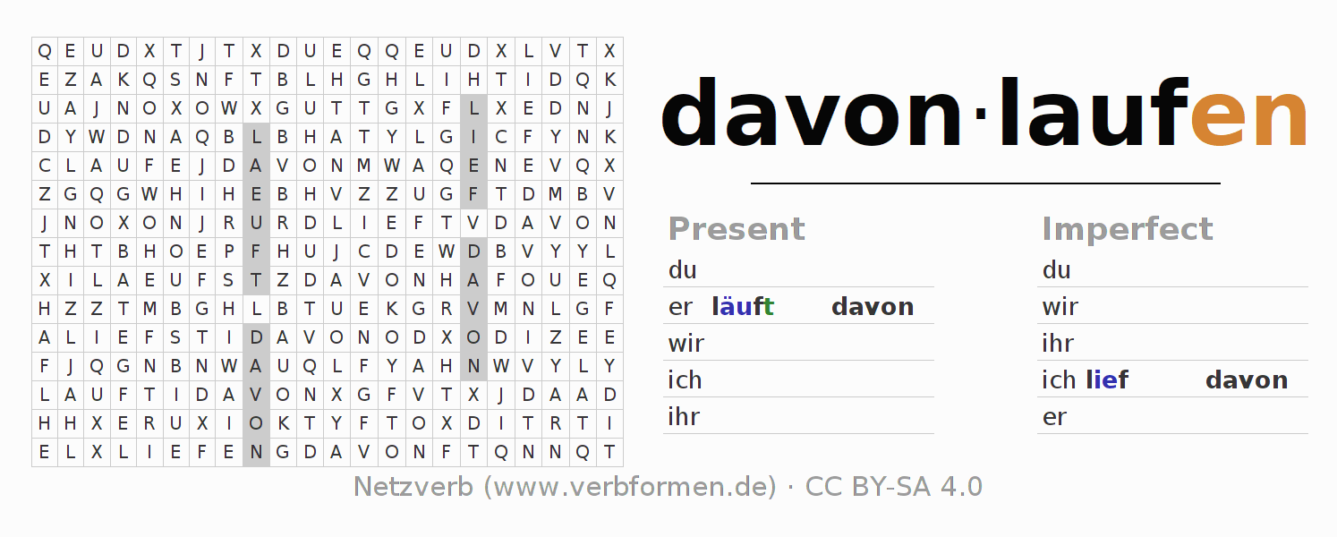 With these search word puzzles you can learn the conjugation of the German verb davonlaufen.