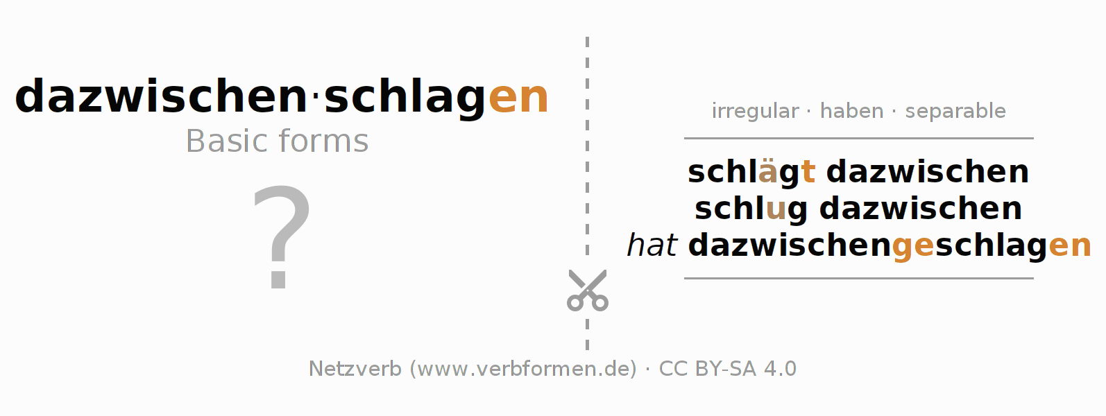 Flash cards, learning cards, learning notes for all tenses of the verb dazwischenschlagen
