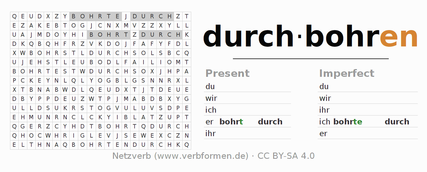 Worksheets are used generally for the conjugation of the verb durchbohren in teaching. The materials can be used as Open Educational Resources (OER) for exercises, for games and as Tasks (CC BY-SA 4.0). There are many different types of tasks available for the verb durch-bohren. These are overview sheets with complete conjugation, puzzles and games that require joint learning. The entire educational material is available for free as a PDF download, as pictures and as an interactive browser version. In addition to the tasks, countless examples for durchbohren also provide an aid to using the verb.