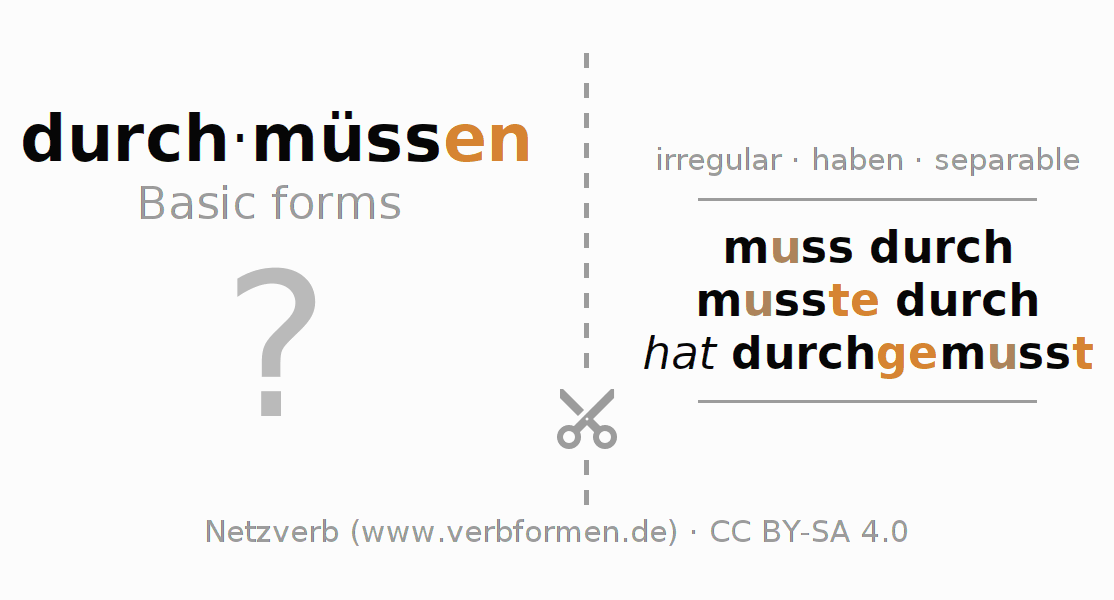 Worksheets are used generally for the conjugation of the verb durchmüssen in teaching. The materials can be used as Open Educational Resources (OER) for exercises, for games and as Tasks (CC BY-SA 4.0). There are many different types of tasks available for the verb durchmüssen. These are overview sheets with complete conjugation, puzzles and games that require joint learning. The entire educational material is available for free as a PDF download, as pictures and as an interactive browser version. In addition to the tasks, countless examples for durchmüssen also provide an aid to using the verb.