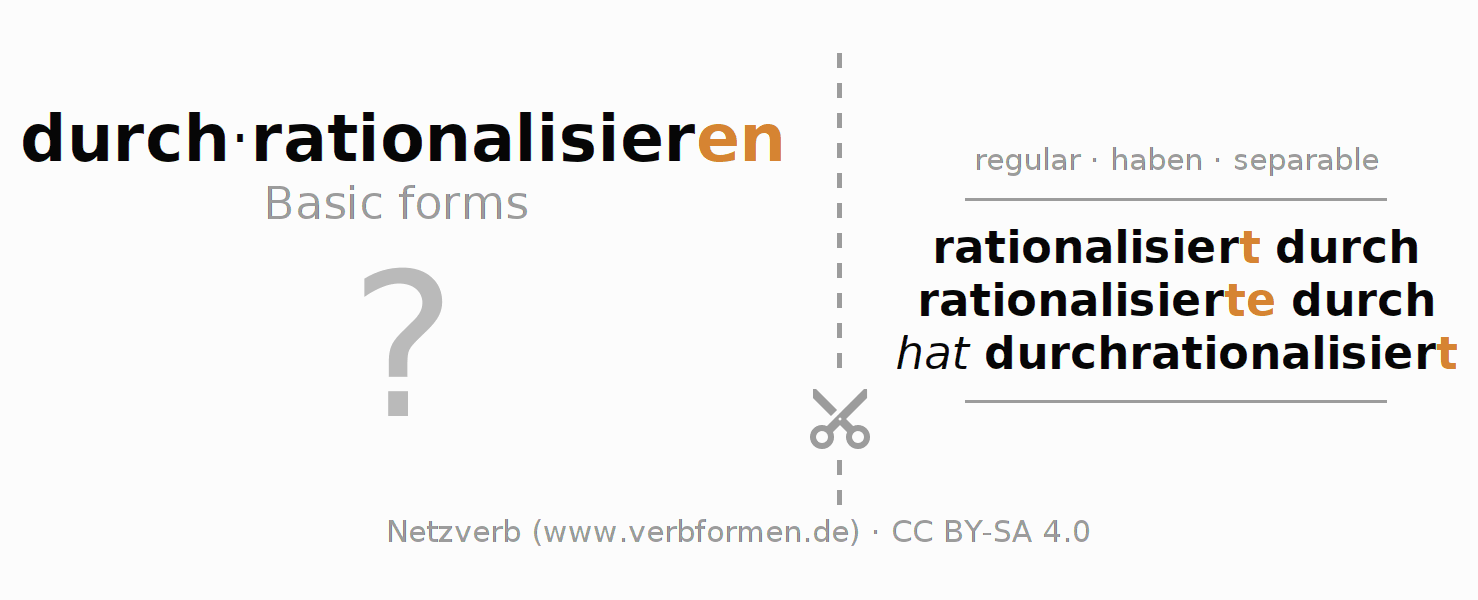 Worksheets are used generally for the conjugation of the verb durchrationalisieren in teaching. The materials can be used as Open Educational Resources (OER) for exercises, for games and as Tasks (CC BY-SA 4.0). There are many different types of tasks available for the verb durchrationalisieren. These are overview sheets with complete conjugation, puzzles and games that require joint learning. The entire educational material is available for free as a PDF download, as pictures and as an interactive browser version. In addition to the tasks, countless examples for durchrationalisieren also provide an aid to using the verb.