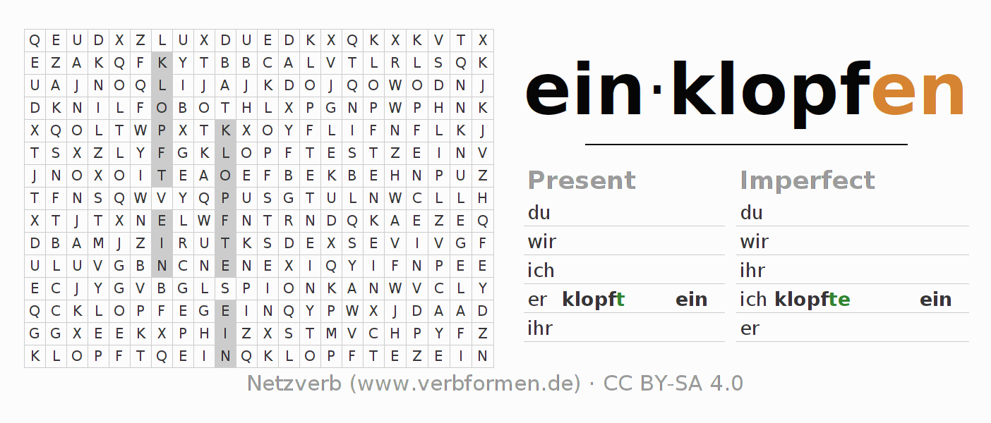 With these search word puzzles you can learn the conjugation of the German verb einklopfen.