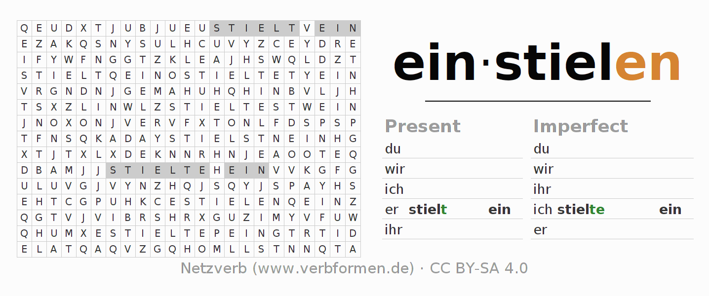 Worksheets are used generally for the conjugation of the verb einstielen in teaching. The materials can be used as Open Educational Resources (OER) for exercises, for games and as Tasks (CC BY-SA 4.0). There are many different types of tasks available for the verb einstielen. These are overview sheets with complete conjugation, puzzles and games that require joint learning. The entire educational material is available for free as a PDF download, as pictures and as an interactive browser version. In addition to the tasks, countless examples for einstielen also provide an aid to using the verb.
