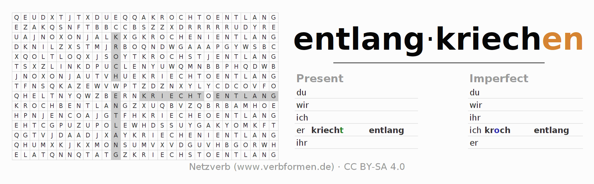 With these search word puzzles you can learn the conjugation of the German verb entlangkriechen.