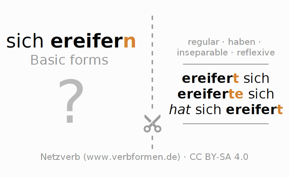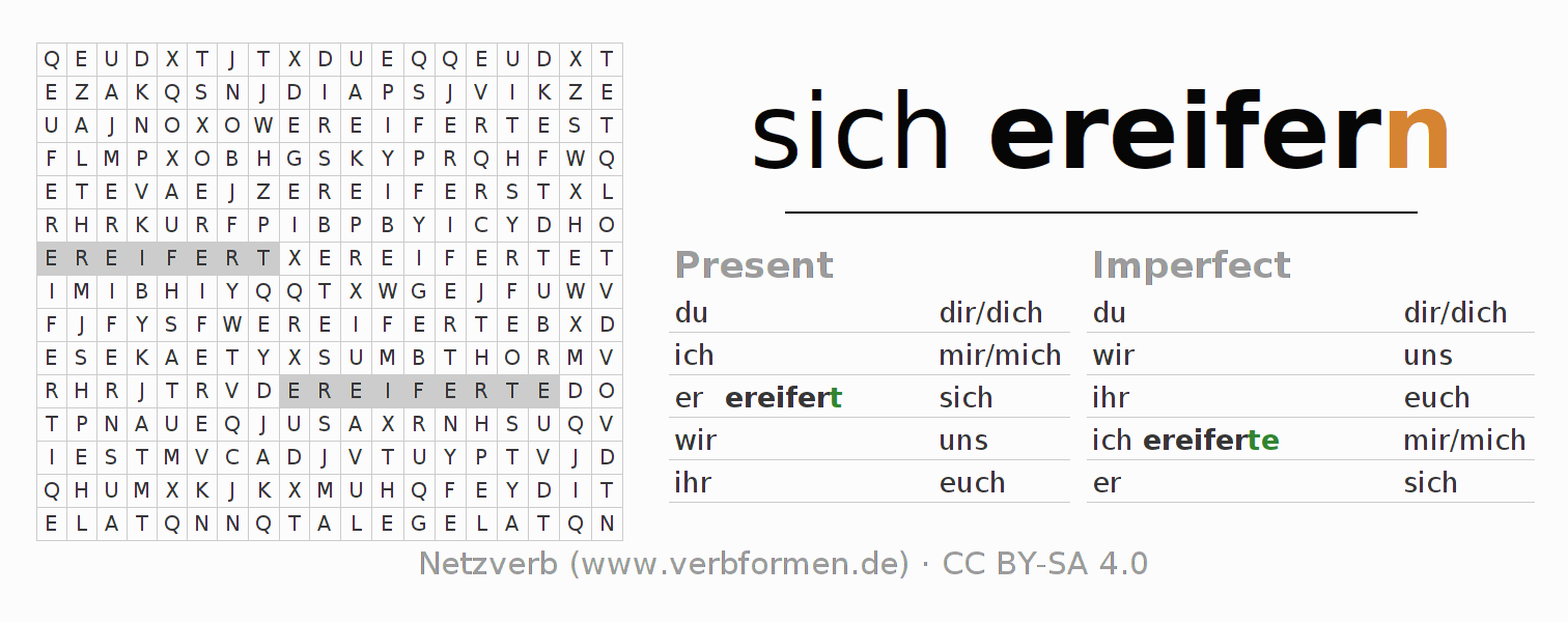 Worksheets are used generally for the conjugation of the verb ereifern in teaching. The materials can be used as Open Educational Resources (OER) for exercises, for games and as Tasks (CC BY-SA 4.0). There are many different types of tasks available for the verb sich ereifern. These are overview sheets with complete conjugation, puzzles and games that require joint learning. The entire educational material is available for free as a PDF download, as pictures and as an interactive browser version. In addition to the tasks, countless examples for ereifern also provide an aid to using the verb.