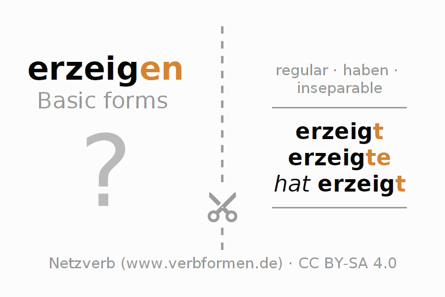 Worksheets are used generally for the conjugation of the verb erzeigen in teaching. The materials can be used as Open Educational Resources (OER) for exercises, for games and as Tasks (CC BY-SA 4.0). There are many different types of tasks available for the verb erzeigen. These are overview sheets with complete conjugation, puzzles and games that require joint learning. The entire educational material is available for free as a PDF download, as pictures and as an interactive browser version. In addition to the tasks, countless examples for erzeigen also provide an aid to using the verb.