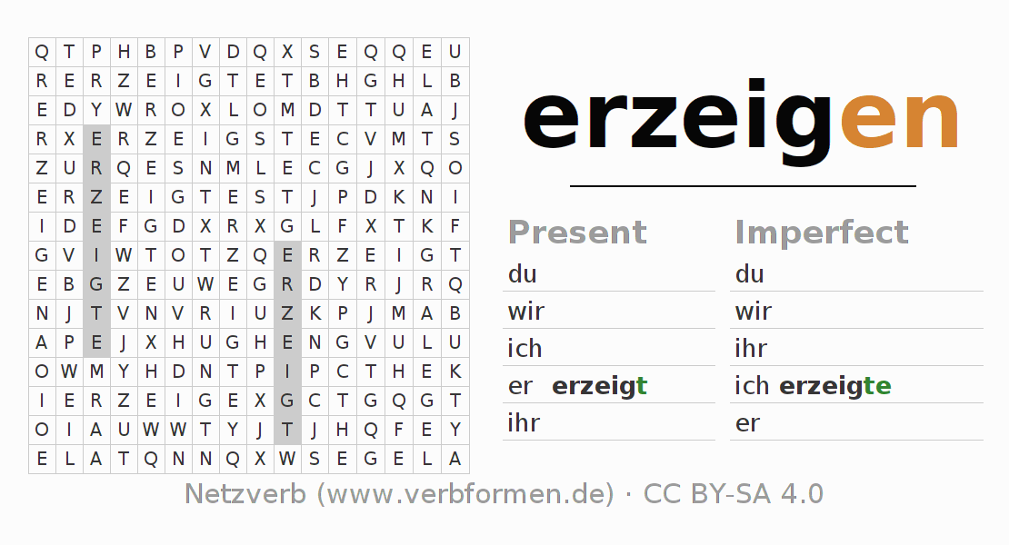 With these search word puzzles you can learn the conjugation of the German verb erzeigen.