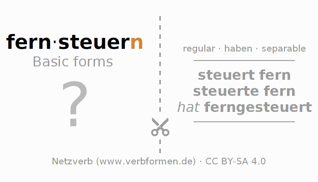 Worksheets are used generally for the conjugation of the verb fernsteuern in teaching. The materials can be used as Open Educational Resources (OER) for exercises, for games and as Tasks (CC BY-SA 4.0). There are many different types of tasks available for the verb fernsteuern. These are overview sheets with complete conjugation, puzzles and games that require joint learning. The entire educational material is available for free as a PDF download, as pictures and as an interactive browser version. In addition to the tasks, countless examples for fernsteuern also provide an aid to using the verb.