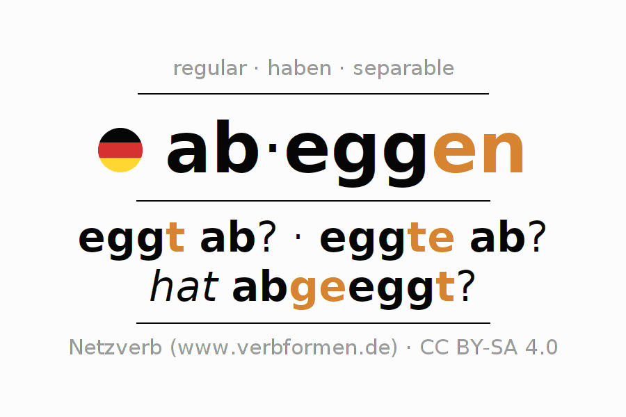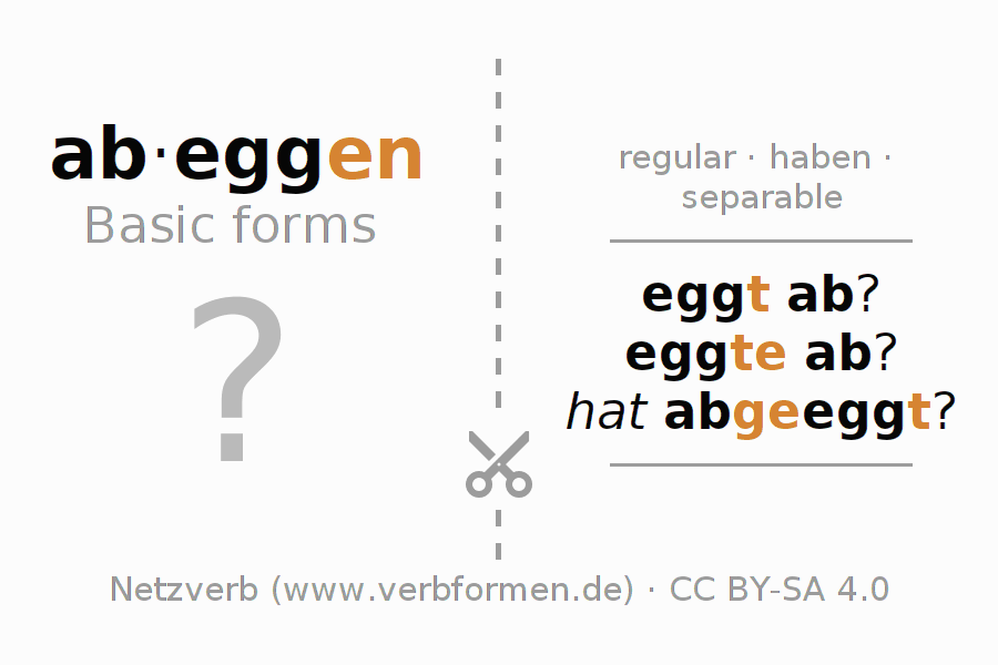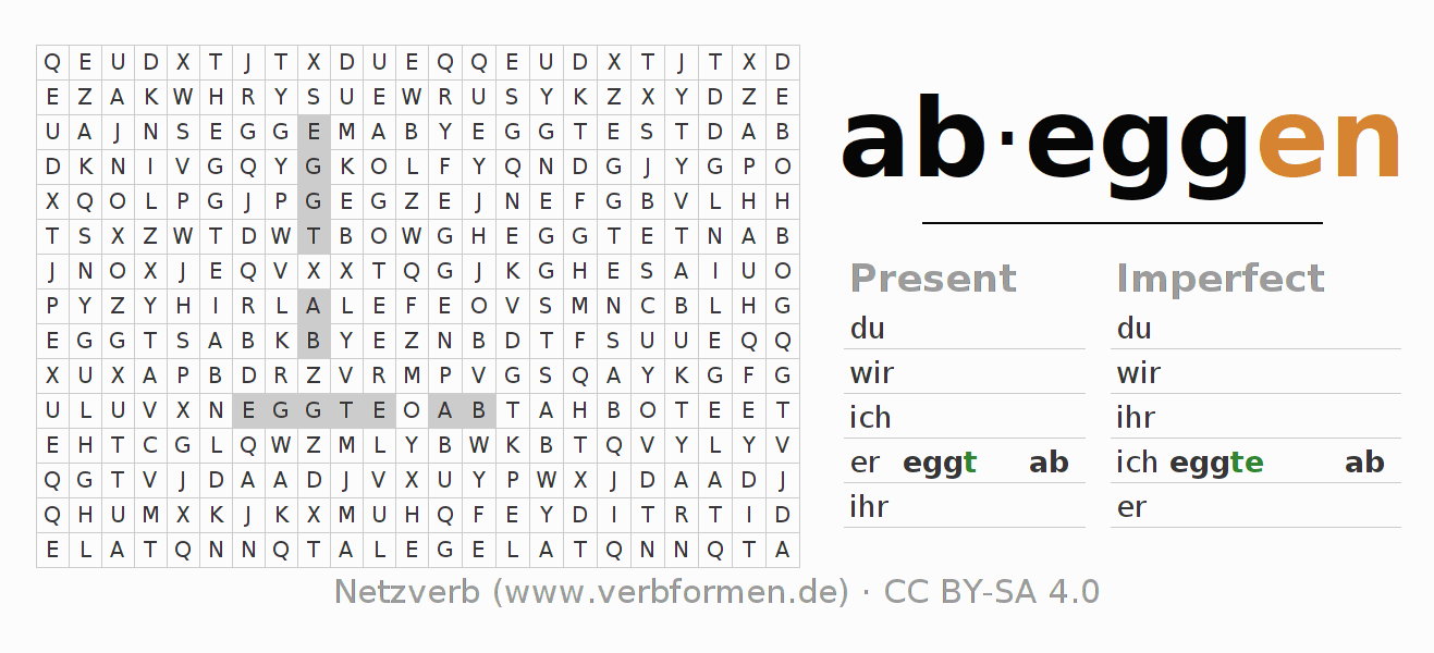 Worksheets are used generally for the conjugation of the verb abeggen in teaching. The materials can be used as Open Educational Resources (OER) for exercises, for games and as Tasks (CC BY-SA 4.0). There are many different types of tasks available for the verb abeggen. These are overview sheets with complete conjugation, puzzles and games that require joint learning. The entire educational material is available for free as a PDF download, as pictures and as an interactive browser version. In addition to the tasks, countless examples for abeggen also provide an aid to using the verb.