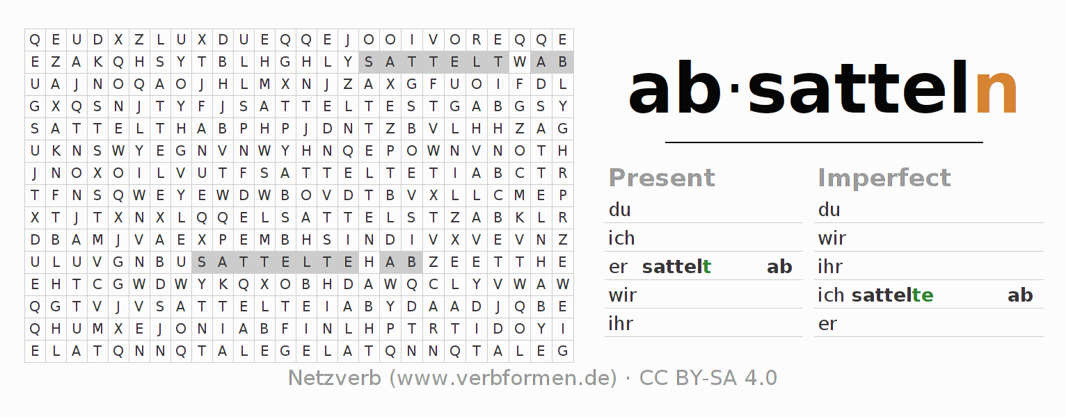 With these search word puzzles you can learn the conjugation of the German verb absatteln.