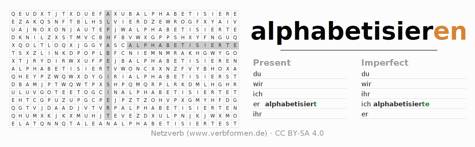 With these search word puzzles you can learn the conjugation of the German verb alphabetisieren.