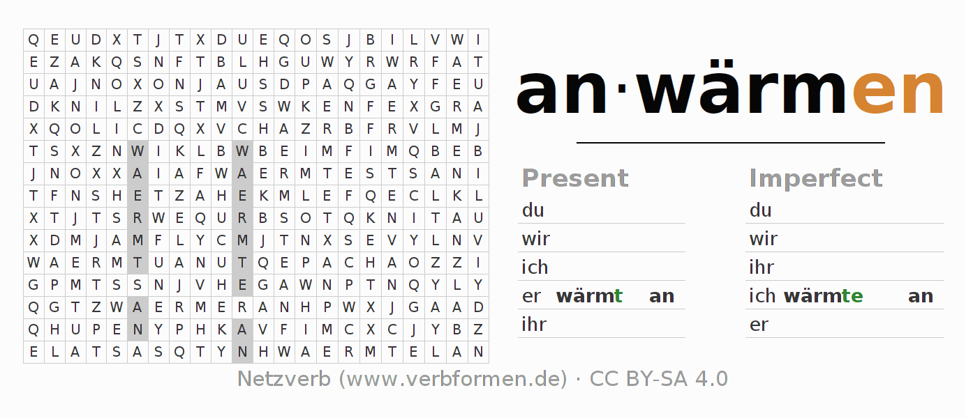With these search word puzzles you can learn the conjugation of the German verb anwärmen.
