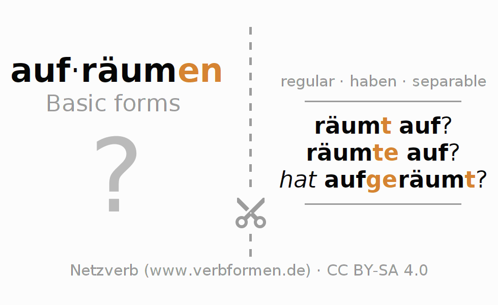 Worksheets are used generally for the conjugation of the verb aufräumen in teaching. The materials can be used as Open Educational Resources (OER) for exercises, for games and as Tasks (CC BY-SA 4.0). There are many different types of tasks available for the verb aufräumen. These are overview sheets with complete conjugation, puzzles and games that require joint learning. The entire educational material is available for free as a PDF download, as pictures and as an interactive browser version. In addition to the tasks, countless examples for aufräumen also provide an aid to using the verb.