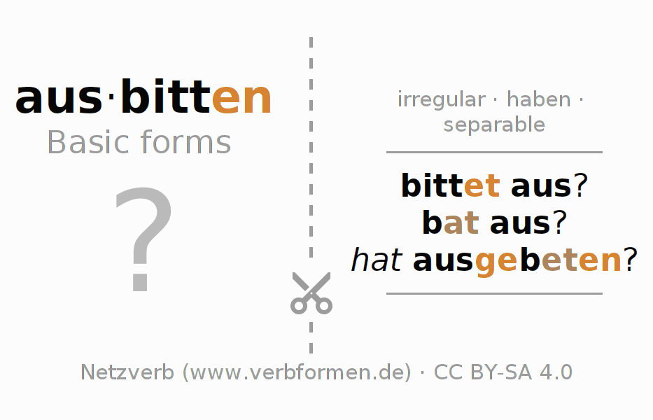 Worksheets are used generally for the conjugation of the verb ausbitten in teaching. The materials can be used as Open Educational Resources (OER) for exercises, for games and as Tasks (CC BY-SA 4.0). There are many different types of tasks available for the verb ausbitten. These are overview sheets with complete conjugation, puzzles and games that require joint learning. The entire educational material is available for free as a PDF download, as pictures and as an interactive browser version. In addition to the tasks, countless examples for ausbitten also provide an aid to using the verb.