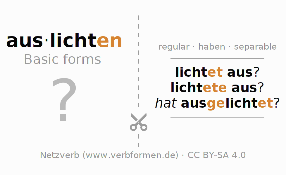 Worksheets are used generally for the conjugation of the verb auslichten in teaching. The materials can be used as Open Educational Resources (OER) for exercises, for games and as Tasks (CC BY-SA 4.0). There are many different types of tasks available for the verb auslichten. These are overview sheets with complete conjugation, puzzles and games that require joint learning. The entire educational material is available for free as a PDF download, as pictures and as an interactive browser version. In addition to the tasks, countless examples for auslichten also provide an aid to using the verb.