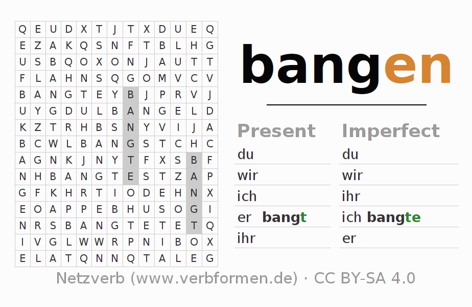 With these search word puzzles you can learn the conjugation of the German verb bangen.
