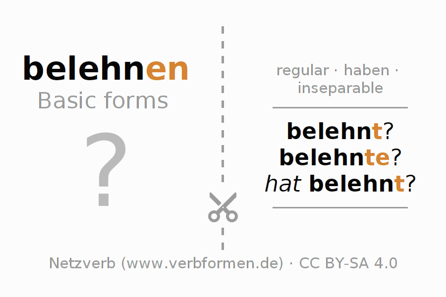 Worksheets are used generally for the conjugation of the verb belehnen in teaching. The materials can be used as Open Educational Resources (OER) for exercises, for games and as Tasks (CC BY-SA 4.0). There are many different types of tasks available for the verb belehnen. These are overview sheets with complete conjugation, puzzles and games that require joint learning. The entire educational material is available for free as a PDF download, as pictures and as an interactive browser version. In addition to the tasks, countless examples for belehnen also provide an aid to using the verb.