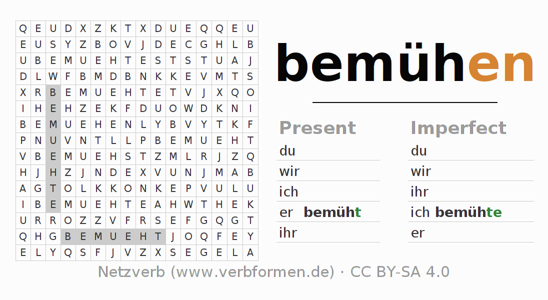 With these search word puzzles you can learn the conjugation of the German verb bemühen.