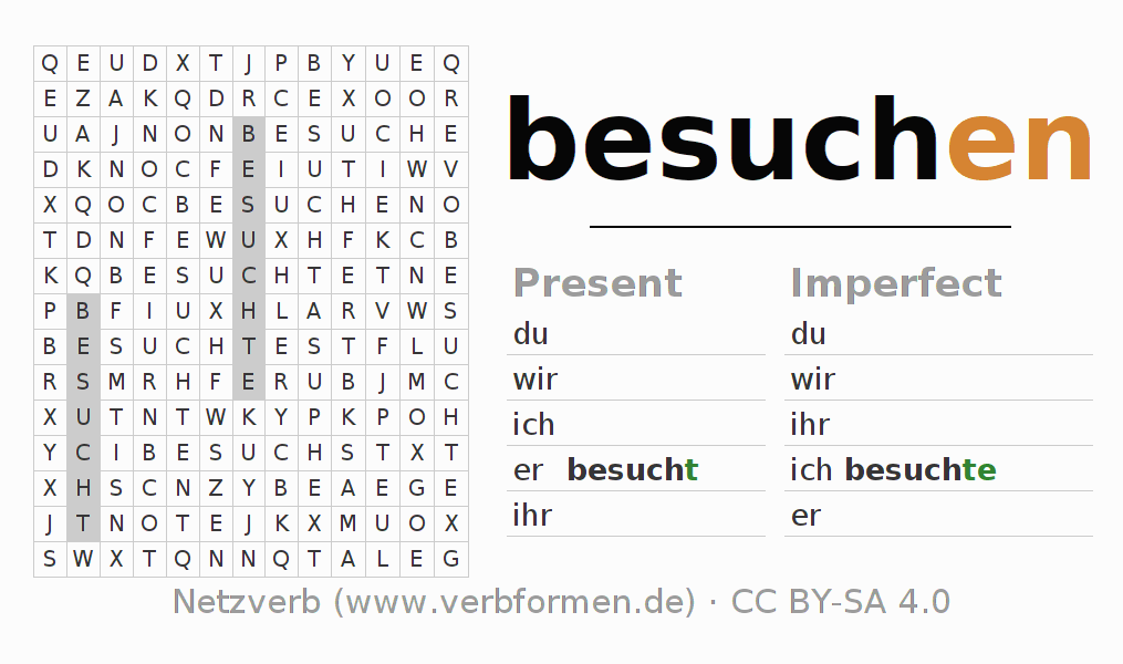 With these search word puzzles you can learn the conjugation of the German verb besuchen.