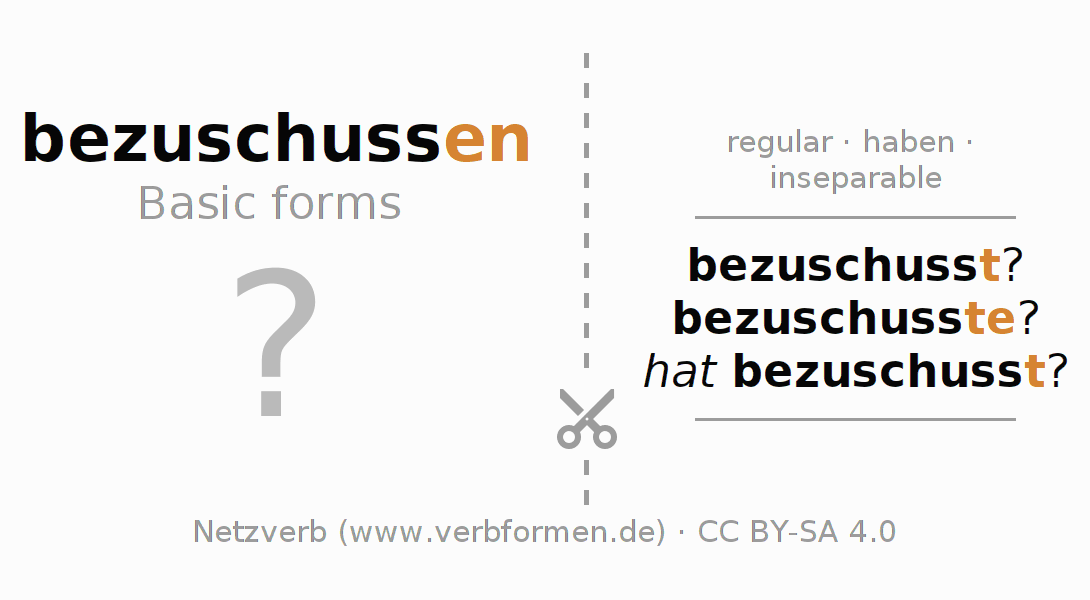 Worksheets are used generally for the conjugation of the verb bezuschussen in teaching. The materials can be used as Open Educational Resources (OER) for exercises, for games and as Tasks (CC BY-SA 4.0). There are many different types of tasks available for the verb bezuschussen. These are overview sheets with complete conjugation, puzzles and games that require joint learning. The entire educational material is available for free as a PDF download, as pictures and as an interactive browser version. In addition to the tasks, countless examples for bezuschussen also provide an aid to using the verb.