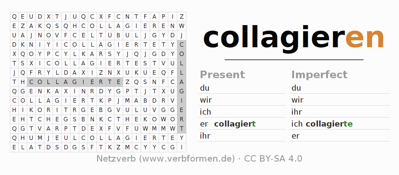 Worksheets are used generally for the conjugation of the verb collagieren in teaching. The materials can be used as Open Educational Resources (OER) for exercises, for games and as Tasks (CC BY-SA 4.0). There are many different types of tasks available for the verb collagieren. These are overview sheets with complete conjugation, puzzles and games that require joint learning. The entire educational material is available for free as a PDF download, as pictures and as an interactive browser version. In addition to the tasks, countless examples for collagieren also provide an aid to using the verb.