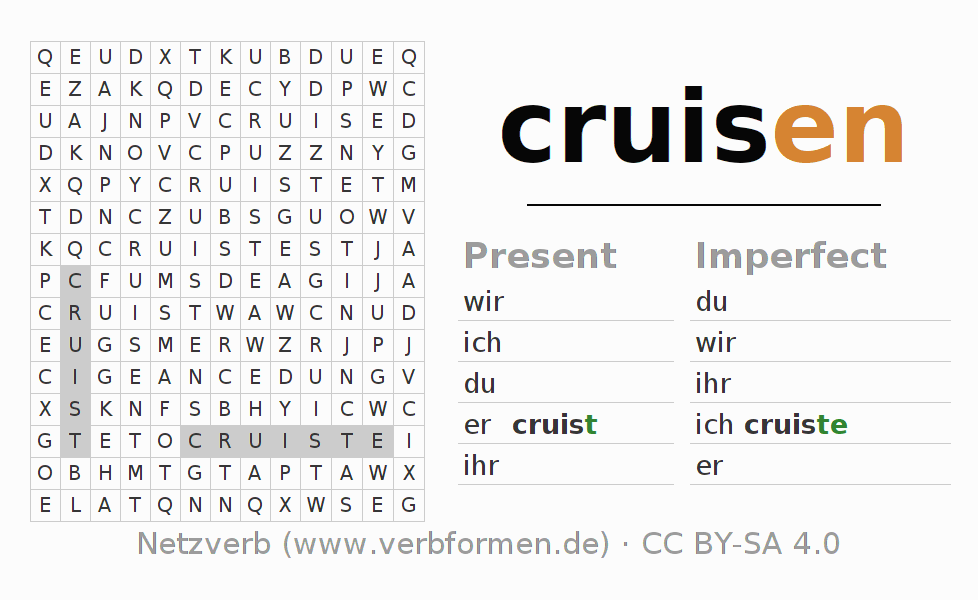With these search word puzzles you can learn the conjugation of the German verb cruisen.