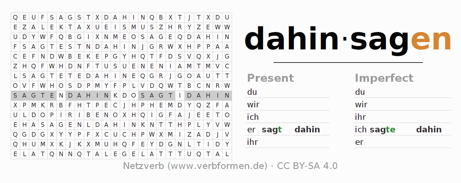 With these search word puzzles you can learn the conjugation of the German verb dahinsagen.