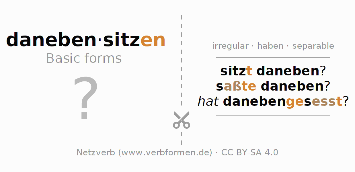 Worksheets are used generally for the conjugation of the verb danebensitzen in teaching. The materials can be used as Open Educational Resources (OER) for exercises, for games and as Tasks (CC BY-SA 4.0). There are many different types of tasks available for the verb danebensitzen. These are overview sheets with complete conjugation, puzzles and games that require joint learning. The entire educational material is available for free as a PDF download, as pictures and as an interactive browser version. In addition to the tasks, countless examples for danebensitzen also provide an aid to using the verb.