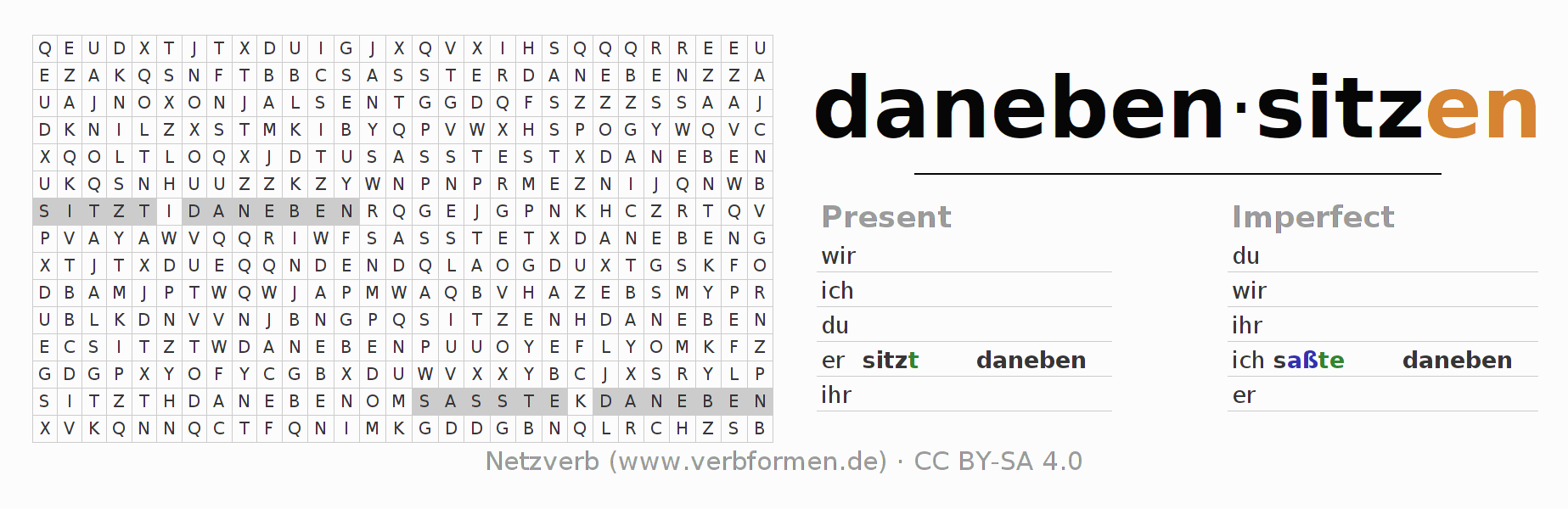 With these search word puzzles you can learn the conjugation of the German verb danebensitzen.