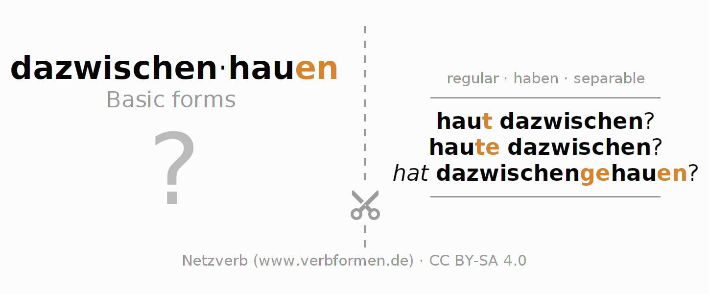 Worksheets are used generally for the conjugation of the verb dazwischenhauen in teaching. The materials can be used as Open Educational Resources (OER) for exercises, for games and as Tasks (CC BY-SA 4.0). There are many different types of tasks available for the verb dazwischenhauen (regelm). These are overview sheets with complete conjugation, puzzles and games that require joint learning. The entire educational material is available for free as a PDF download, as pictures and as an interactive browser version. In addition to the tasks, countless examples for dazwischenhauen also provide an aid to using the verb.