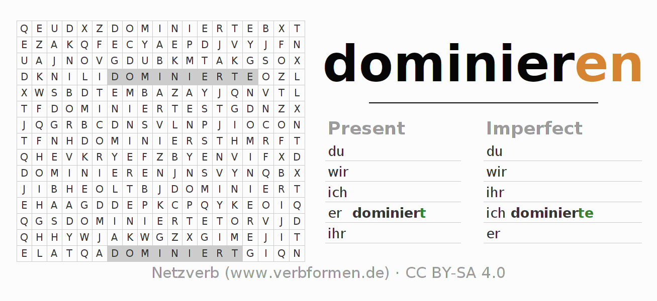 With these search word puzzles you can learn the conjugation of the German verb dominieren.
