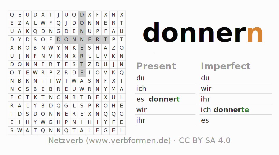 With these search word puzzles you can learn the conjugation of the German verb donnern.