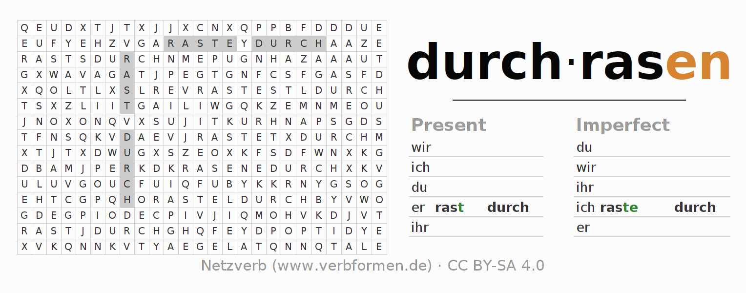 With these search word puzzles you can learn the conjugation of the German verb durchrasen.