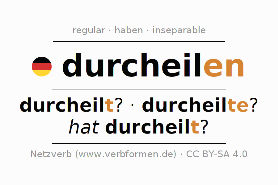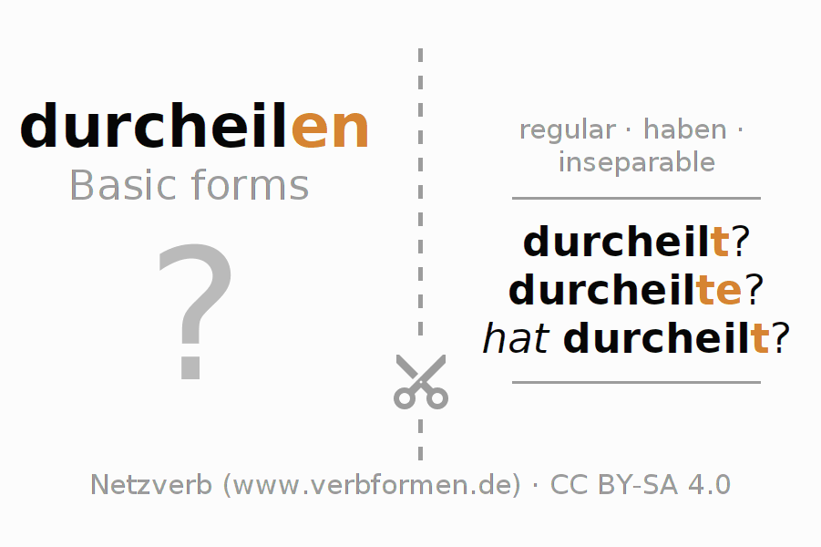 Worksheets are used generally for the conjugation of the verb durcheilen in teaching. The materials can be used as Open Educational Resources (OER) for exercises, for games and as Tasks (CC BY-SA 4.0). There are many different types of tasks available for the verb durcheilen (hat). These are overview sheets with complete conjugation, puzzles and games that require joint learning. The entire educational material is available for free as a PDF download, as pictures and as an interactive browser version. In addition to the tasks, countless examples for durcheilen also provide an aid to using the verb.