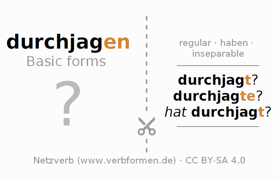 Worksheets are used generally for the conjugation of the verb durchjagen in teaching. The materials can be used as Open Educational Resources (OER) for exercises, for games and as Tasks (CC BY-SA 4.0). There are many different types of tasks available for the verb durchjagen (hat). These are overview sheets with complete conjugation, puzzles and games that require joint learning. The entire educational material is available for free as a PDF download, as pictures and as an interactive browser version. In addition to the tasks, countless examples for durchjagen also provide an aid to using the verb.