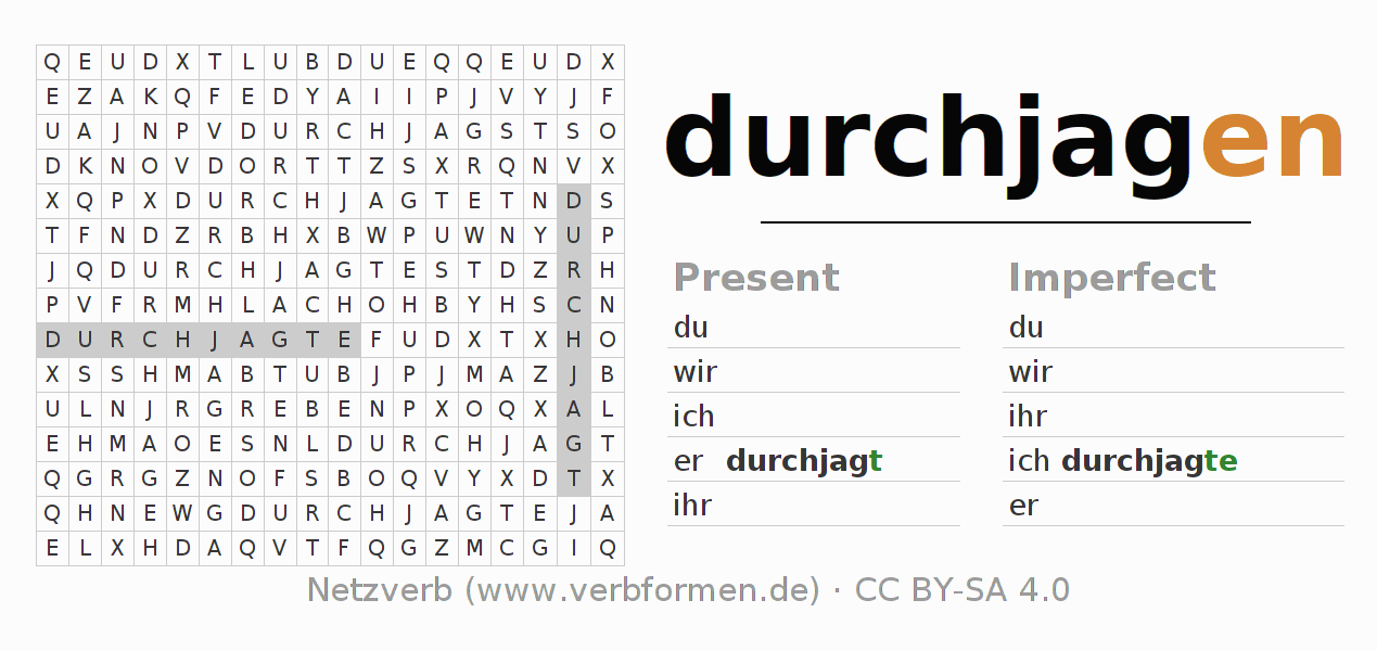 With these search word puzzles you can learn the conjugation of the German verb durchjagen.