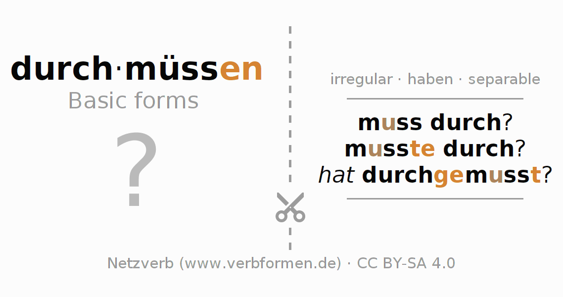 Worksheets are used generally for the conjugation of the verb durchmüssen in teaching. The materials can be used as Open Educational Resources (OER) for exercises, for games and as Tasks (CC BY-SA 4.0). There are many different types of tasks available for the verb durchmüssen. These are overview sheets with complete conjugation, puzzles and games that require joint learning. The entire educational material is available for free as a PDF download, as pictures and as an interactive browser version. In addition to the tasks, countless examples for durchmüssen also provide an aid to using the verb.