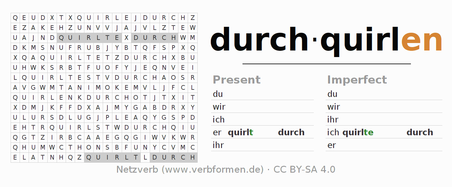 Worksheets are used generally for the conjugation of the verb durchquirlen in teaching. The materials can be used as Open Educational Resources (OER) for exercises, for games and as Tasks (CC BY-SA 4.0). There are many different types of tasks available for the verb durchquirlen. These are overview sheets with complete conjugation, puzzles and games that require joint learning. The entire educational material is available for free as a PDF download, as pictures and as an interactive browser version. In addition to the tasks, countless examples for durchquirlen also provide an aid to using the verb.