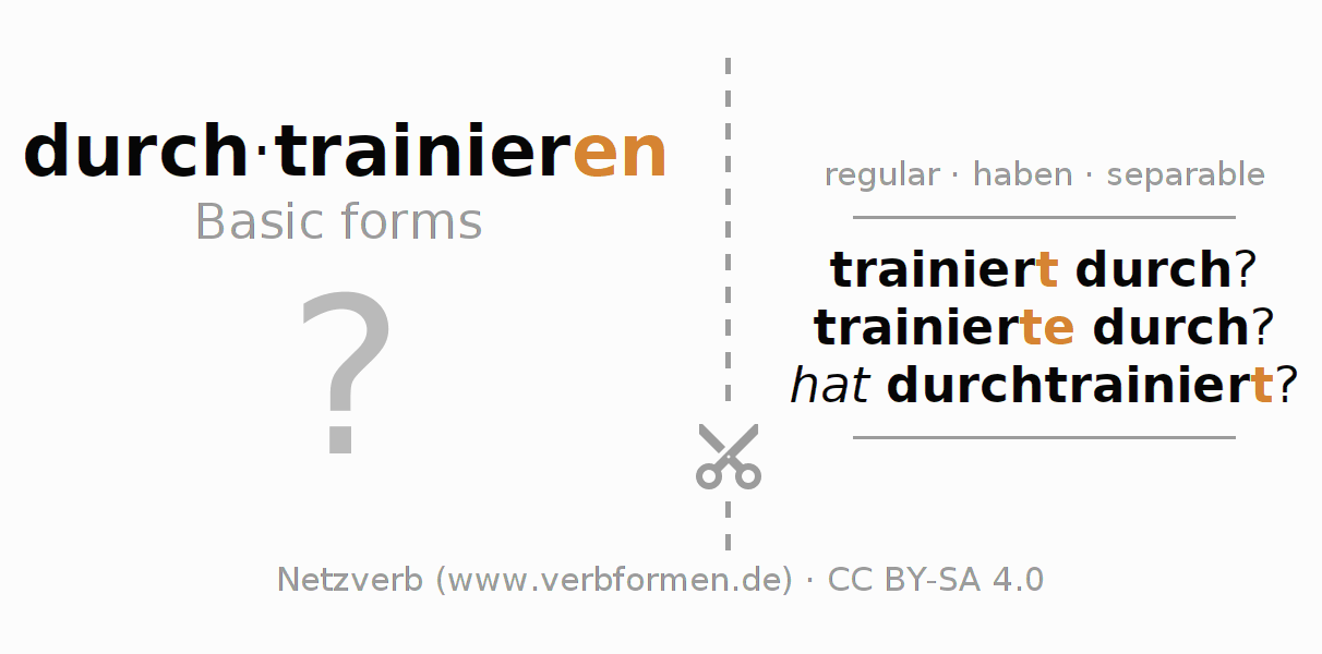 Worksheets are used generally for the conjugation of the verb durchtrainieren in teaching. The materials can be used as Open Educational Resources (OER) for exercises, for games and as Tasks (CC BY-SA 4.0). There are many different types of tasks available for the verb durchtrainieren. These are overview sheets with complete conjugation, puzzles and games that require joint learning. The entire educational material is available for free as a PDF download, as pictures and as an interactive browser version. In addition to the tasks, countless examples for durchtrainieren also provide an aid to using the verb.