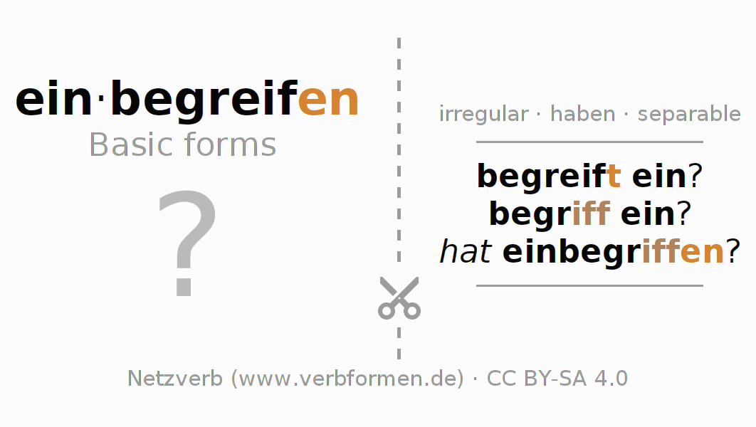 Worksheets are used generally for the conjugation of the verb einbegreifen in teaching. The materials can be used as Open Educational Resources (OER) for exercises, for games and as Tasks (CC BY-SA 4.0). There are many different types of tasks available for the verb einbegreifen. These are overview sheets with complete conjugation, puzzles and games that require joint learning. The entire educational material is available for free as a PDF download, as pictures and as an interactive browser version. In addition to the tasks, countless examples for einbegreifen also provide an aid to using the verb.
