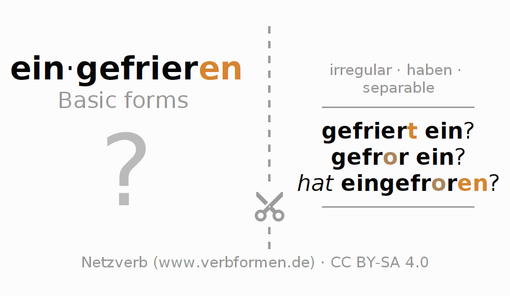 Worksheets are used generally for the conjugation of the verb eingefrieren in teaching. The materials can be used as Open Educational Resources (OER) for exercises, for games and as Tasks (CC BY-SA 4.0). There are many different types of tasks available for the verb eingefrieren. These are overview sheets with complete conjugation, puzzles and games that require joint learning. The entire educational material is available for free as a PDF download, as pictures and as an interactive browser version. In addition to the tasks, countless examples for eingefrieren also provide an aid to using the verb.