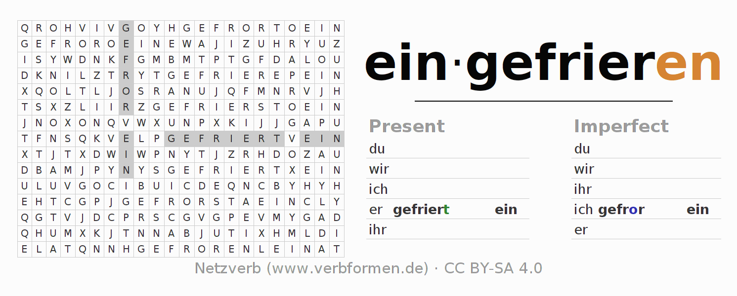 With these search word puzzles you can learn the conjugation of the German verb eingefrieren.