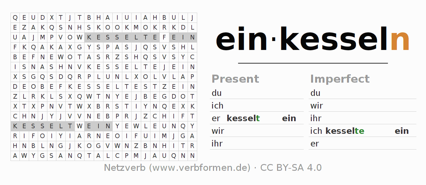 Worksheets are used generally for the conjugation of the verb einkesseln in teaching. The materials can be used as Open Educational Resources (OER) for exercises, for games and as Tasks (CC BY-SA 4.0). There are many different types of tasks available for the verb einkesseln. These are overview sheets with complete conjugation, puzzles and games that require joint learning. The entire educational material is available for free as a PDF download, as pictures and as an interactive browser version. In addition to the tasks, countless examples for einkesseln also provide an aid to using the verb.