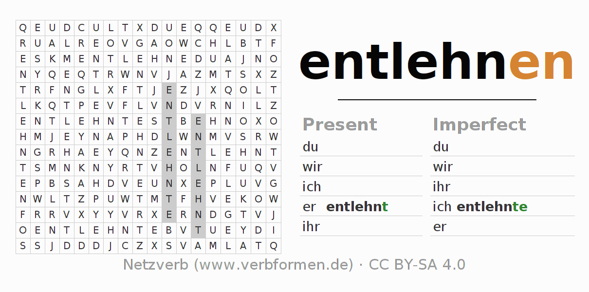 With these search word puzzles you can learn the conjugation of the German verb entlehnen.