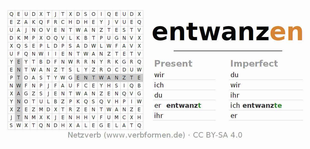 Worksheets are used generally for the conjugation of the verb entwanzen in teaching. The materials can be used as Open Educational Resources (OER) for exercises, for games and as Tasks (CC BY-SA 4.0). There are many different types of tasks available for the verb entwanzen. These are overview sheets with complete conjugation, puzzles and games that require joint learning. The entire educational material is available for free as a PDF download, as pictures and as an interactive browser version. In addition to the tasks, countless examples for entwanzen also provide an aid to using the verb.