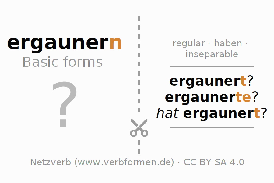Worksheets are used generally for the conjugation of the verb ergaunern in teaching. The materials can be used as Open Educational Resources (OER) for exercises, for games and as Tasks (CC BY-SA 4.0). There are many different types of tasks available for the verb ergaunern. These are overview sheets with complete conjugation, puzzles and games that require joint learning. The entire educational material is available for free as a PDF download, as pictures and as an interactive browser version. In addition to the tasks, countless examples for ergaunern also provide an aid to using the verb.