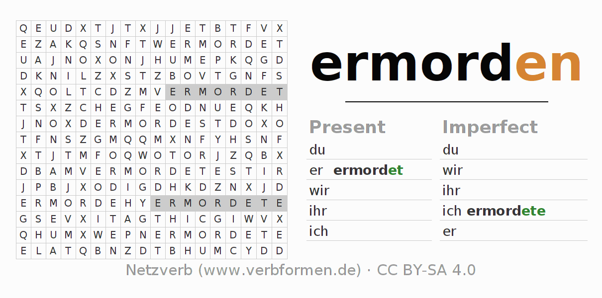 With these search word puzzles you can learn the conjugation of the German verb ermorden.