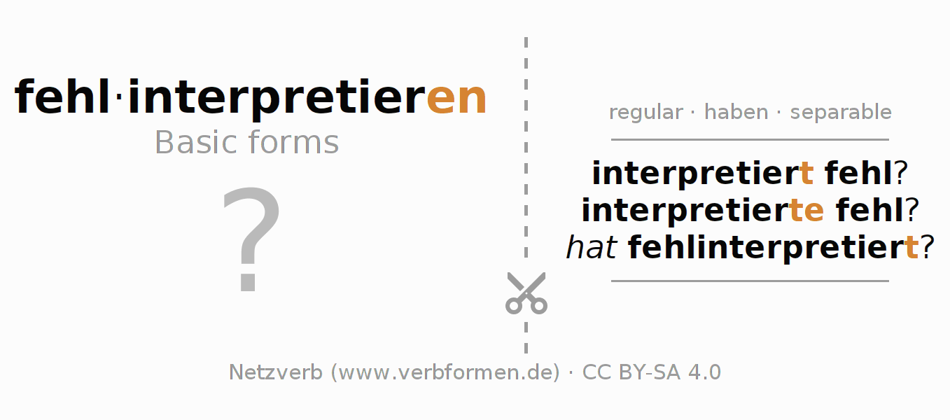 Worksheets are used generally for the conjugation of the verb fehlinterpretieren in teaching. The materials can be used as Open Educational Resources (OER) for exercises, for games and as Tasks (CC BY-SA 4.0). There are many different types of tasks available for the verb fehlinterpretieren. These are overview sheets with complete conjugation, puzzles and games that require joint learning. The entire educational material is available for free as a PDF download, as pictures and as an interactive browser version. In addition to the tasks, countless examples for fehlinterpretieren also provide an aid to using the verb.